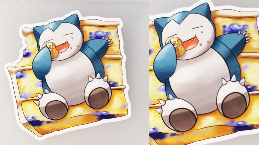 Fun and colourful sticker of the lazy boy on a big piece of blueberry lemon cake.